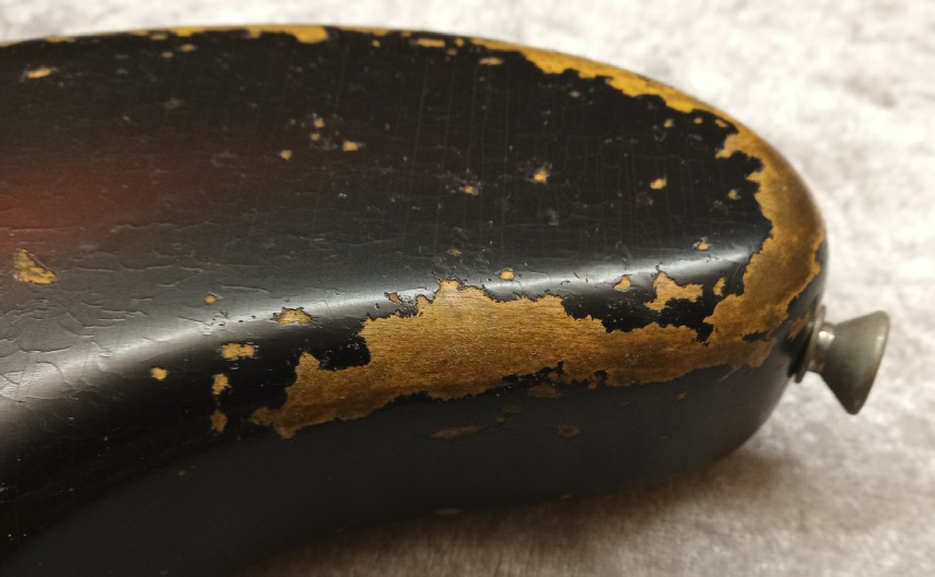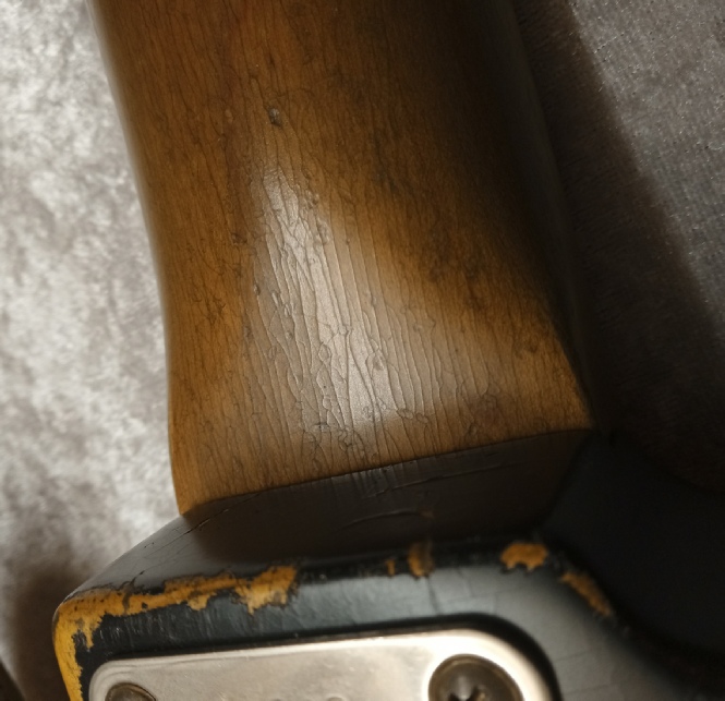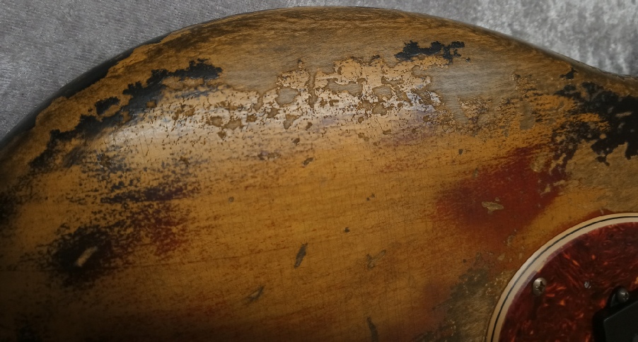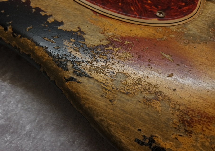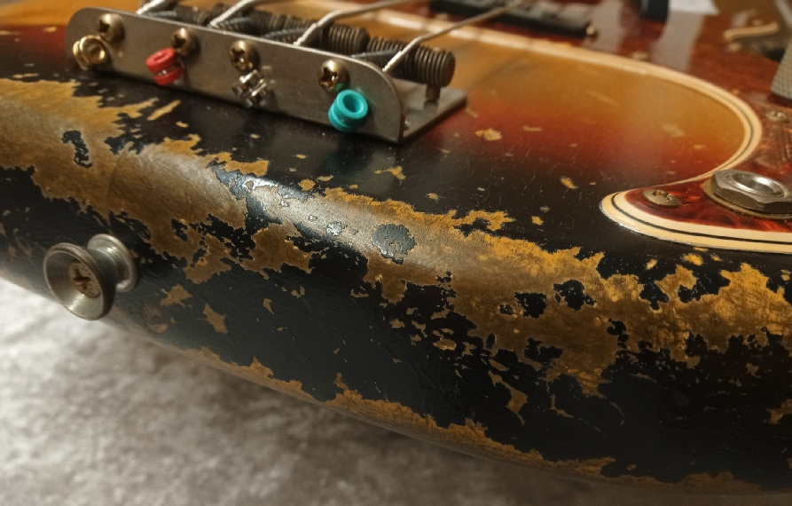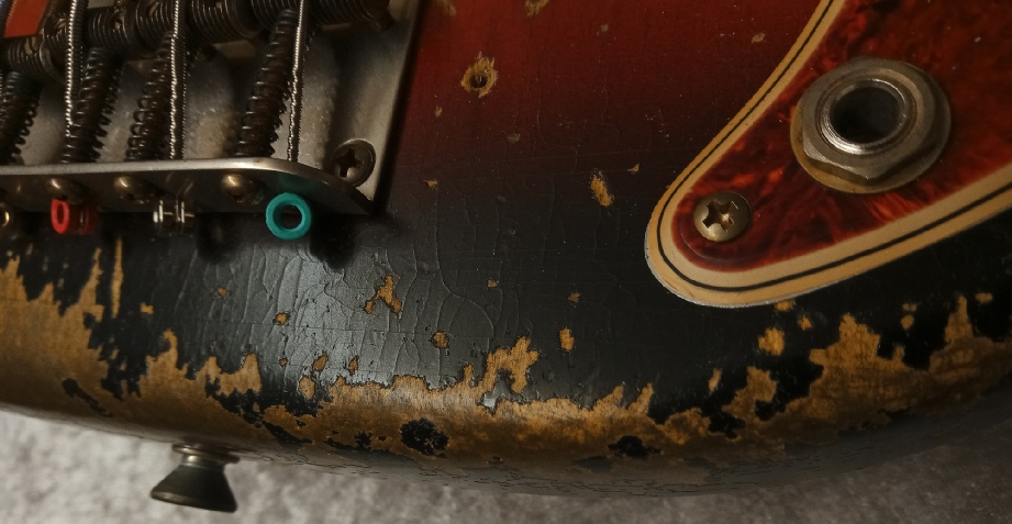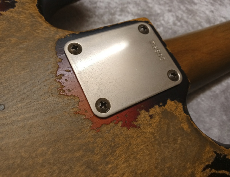 The pickguard is 4 ply celluloid tortoise shell, with the vintage correct thin black layer and 30 degree bevelled edge, there is also a full dimension aluminium shielding plate beneath that, this can be seen just peeping out here and there as you will see on vintage originals due to guard shrinkage.