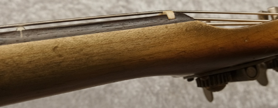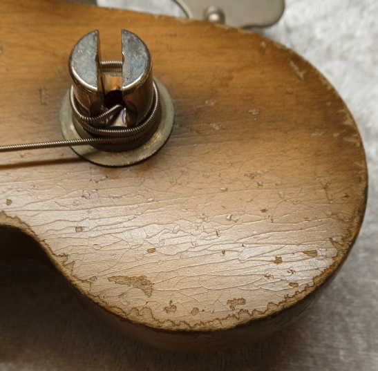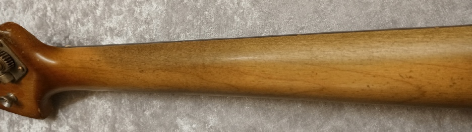 The bass features vintage style hardware throughout, from the reverse ‘Kluson’ style tuners to the threaded saddle bridge. The knobs are the aluminium type as would have been used at the time, even the tug bar and the useless ‘hootenanny’ strap button on the back of the headstock are present..!